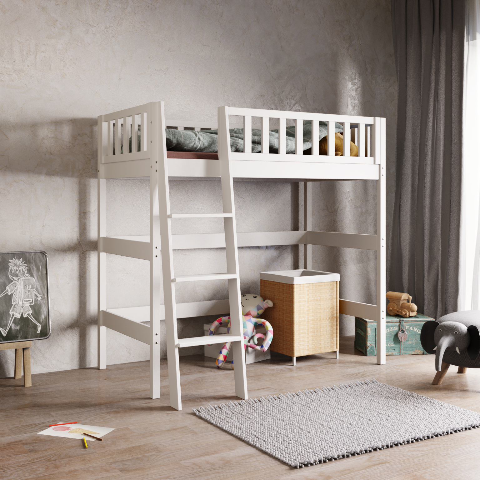 De ruimte onder het bed blijft bruikbaar en kan op verschillende manieren worden ingericht. Denk aan een speelhoek, een gezellige leesplek of een functionele opbergruimte. Hierdoor ontstaat een kamer die niet alleen efficiënt is ingericht, maar ook uitnodigend en veelzijdig blijft.