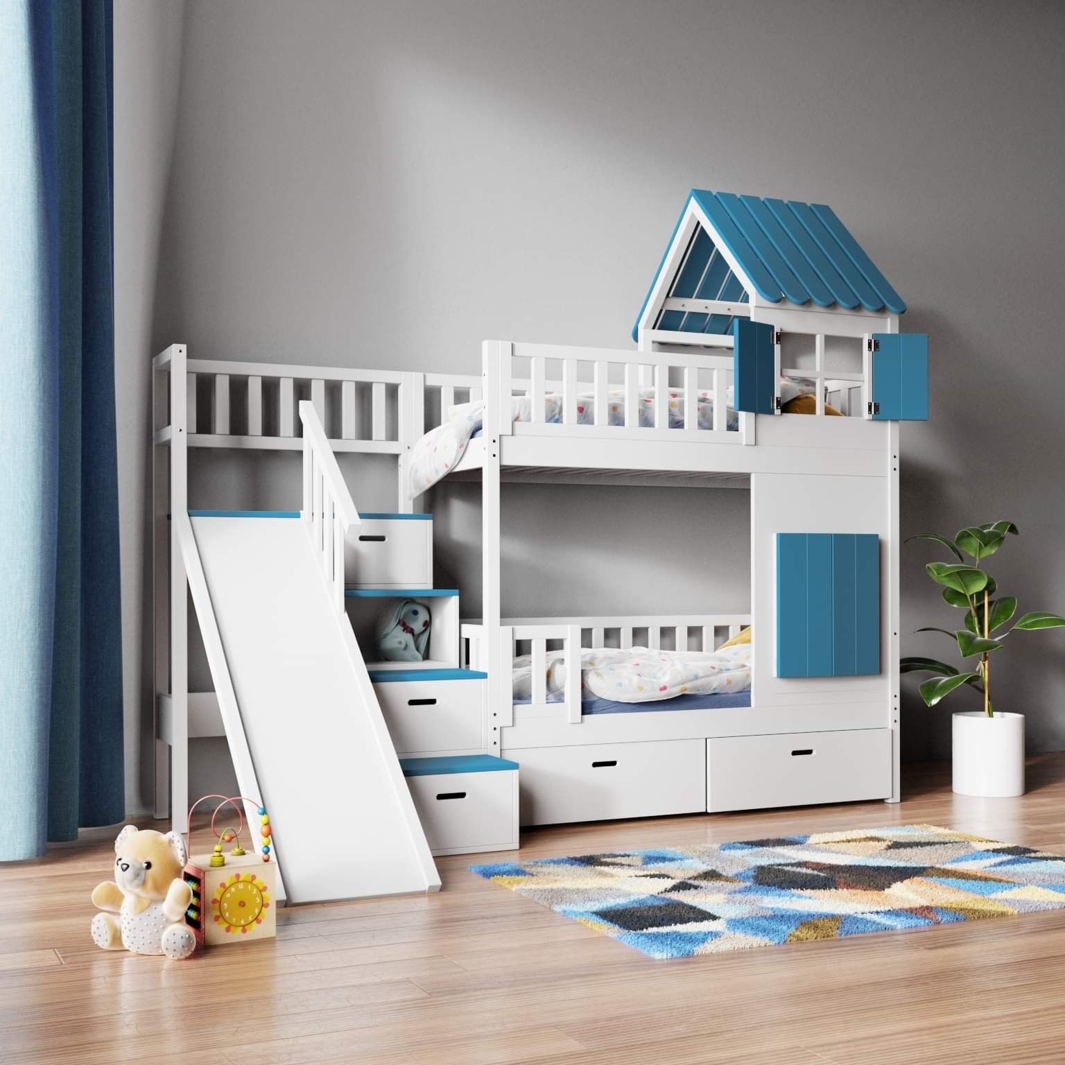 Het huisvormige ontwerp maakt dit kinder stapelbed met trap, glijbaan en lades bijzonder aantrekkelijk.