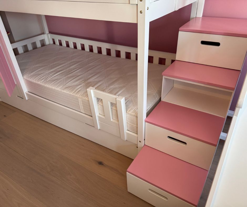 Een kinderbed met trap is ontworpen met het oog op dagelijks gebruik. De trap zorgt voor een veilige en stabiele toegang tot het bed, wat belangrijk is voor kinderen.