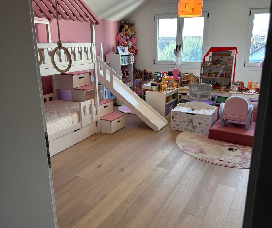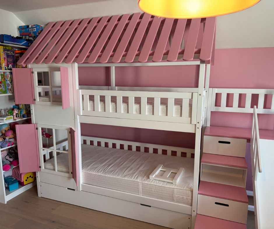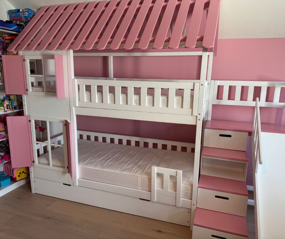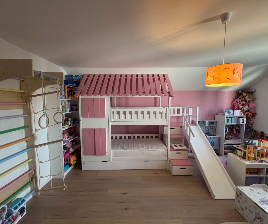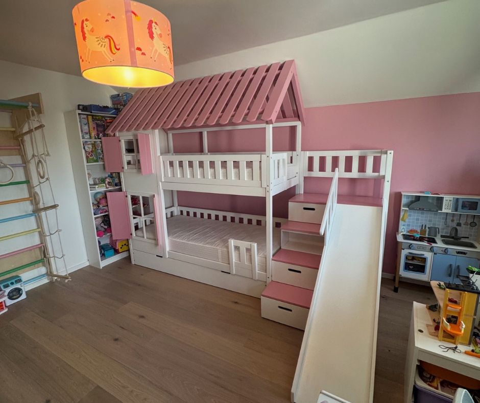 Een kinderbed met trap en glijbaan biedt kinderen veel meer dan alleen een plek om te slapen. Het wordt een centraal element in de kamer waar beweging, fantasie en ontspanning samenkomen.