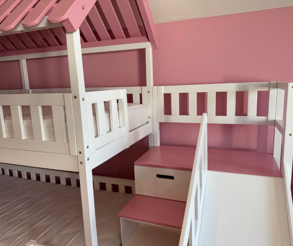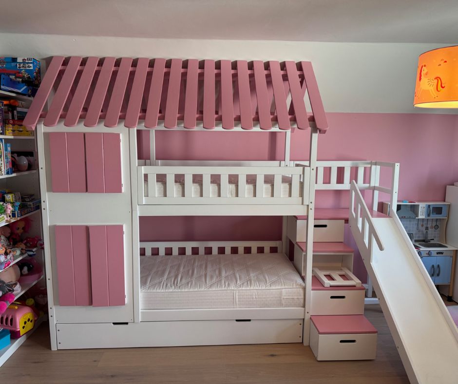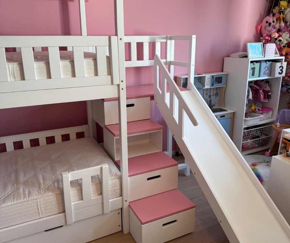 Het bed combineert een comfortabele slaapruimte met een speelse glijbaan en een veilige trap, waardoor het dagelijks gebruik zowel praktisch als leuk wordt.