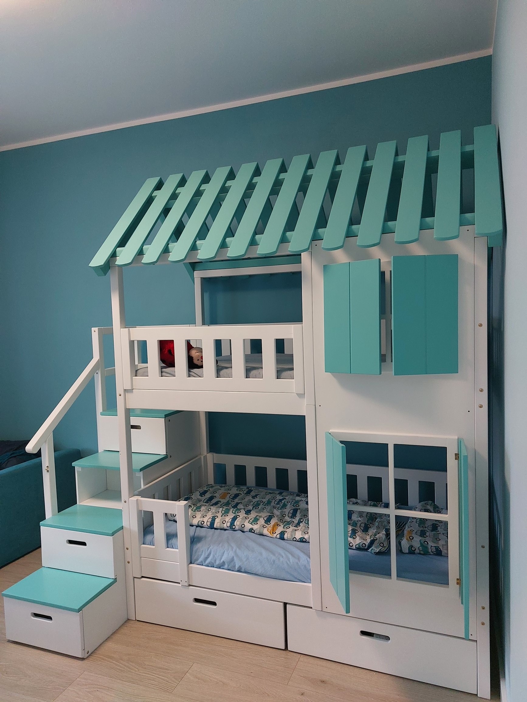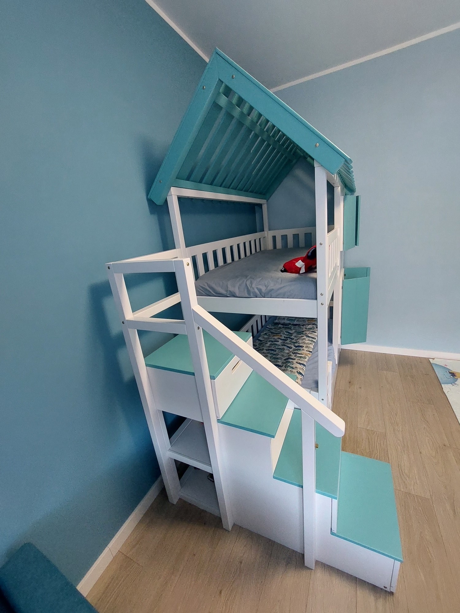 Het kinderbed met trap en dak is niet alleen een functioneel meubelstuk, maar ook een speels element dat de fantasie stimuleert en creativiteit bevordert. Ideaal voor broers, zussen of vriendjes die samen willen slapen in een unieke en gezellige omgeving.