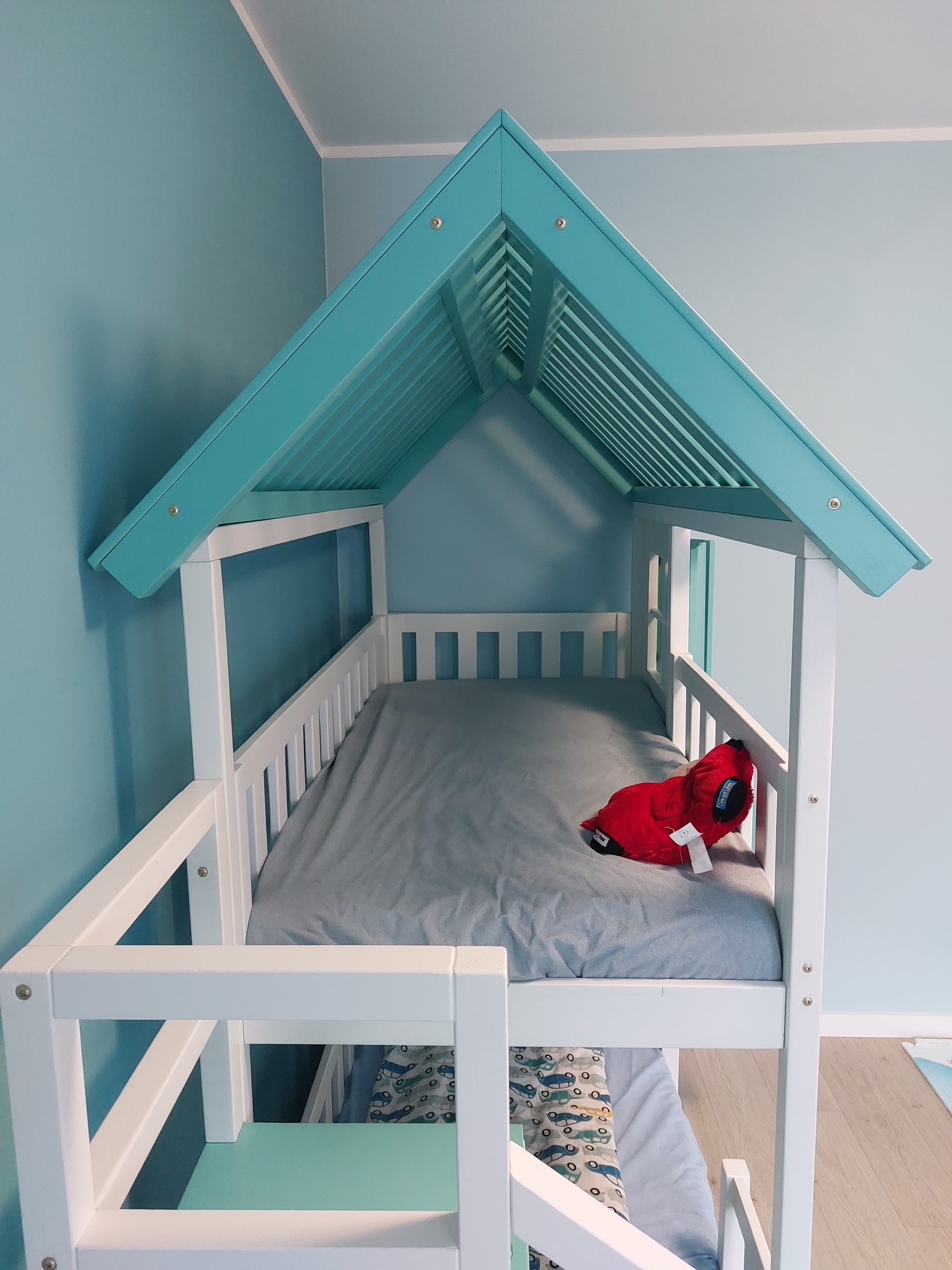 De verhoogde slaapplaats in de vorm van een huisje geeft kinderen een gevoel van veiligheid en geborgenheid. Met leuke details zoals een dakstructuur en open vormen wordt het bed een plek waar kinderen zich helemaal thuis voelen.