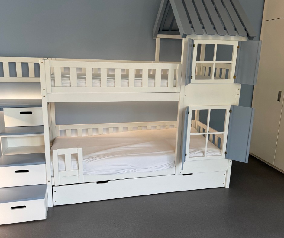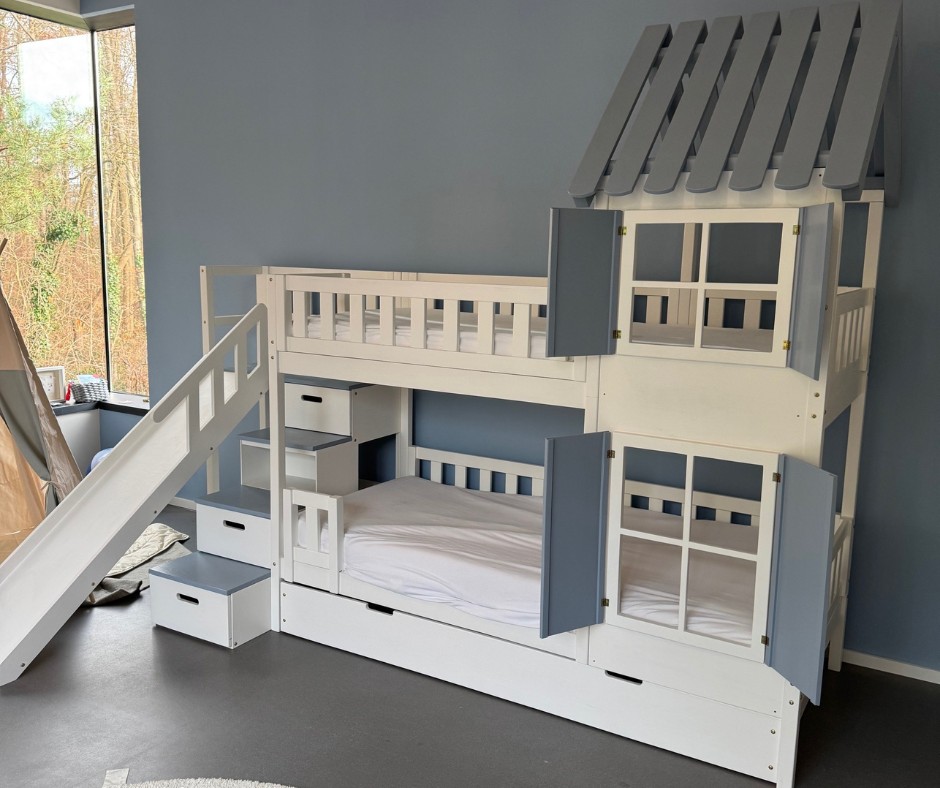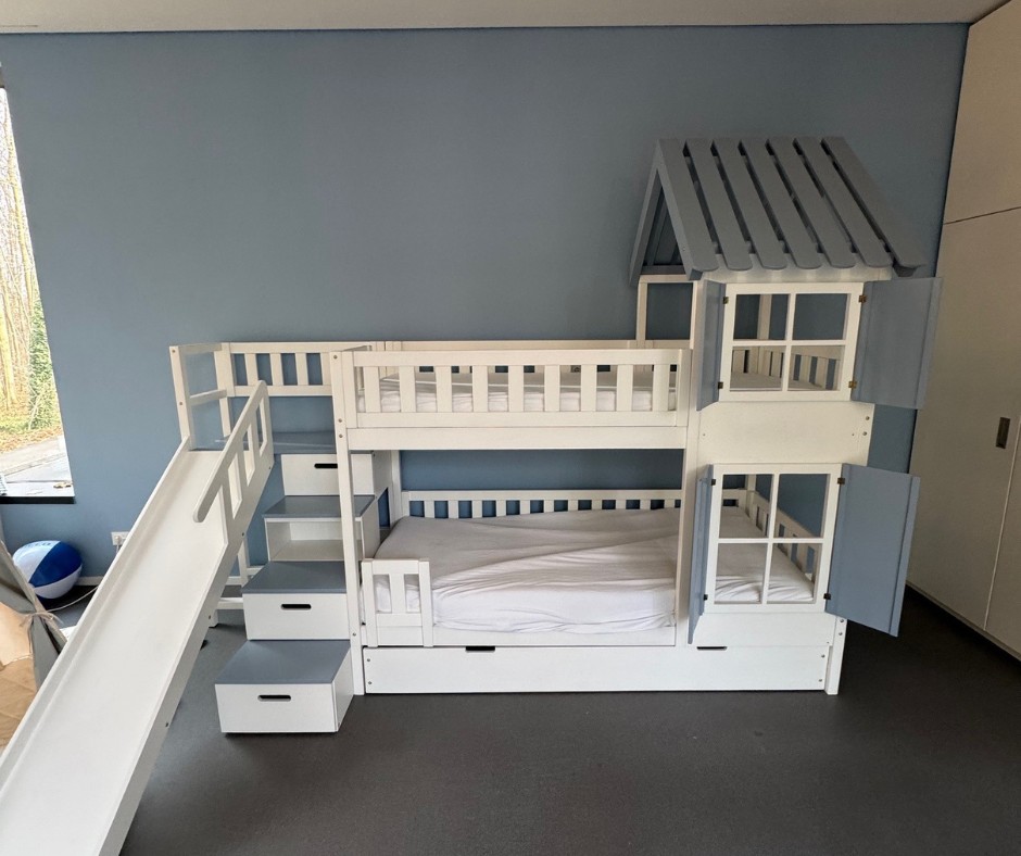 Een maatwerk stapelbed met trap, dak en glijbaan biedt een unieke combinatie van design, comfort en gebruiksgemak.