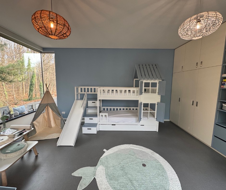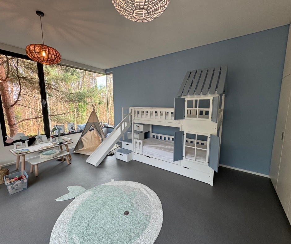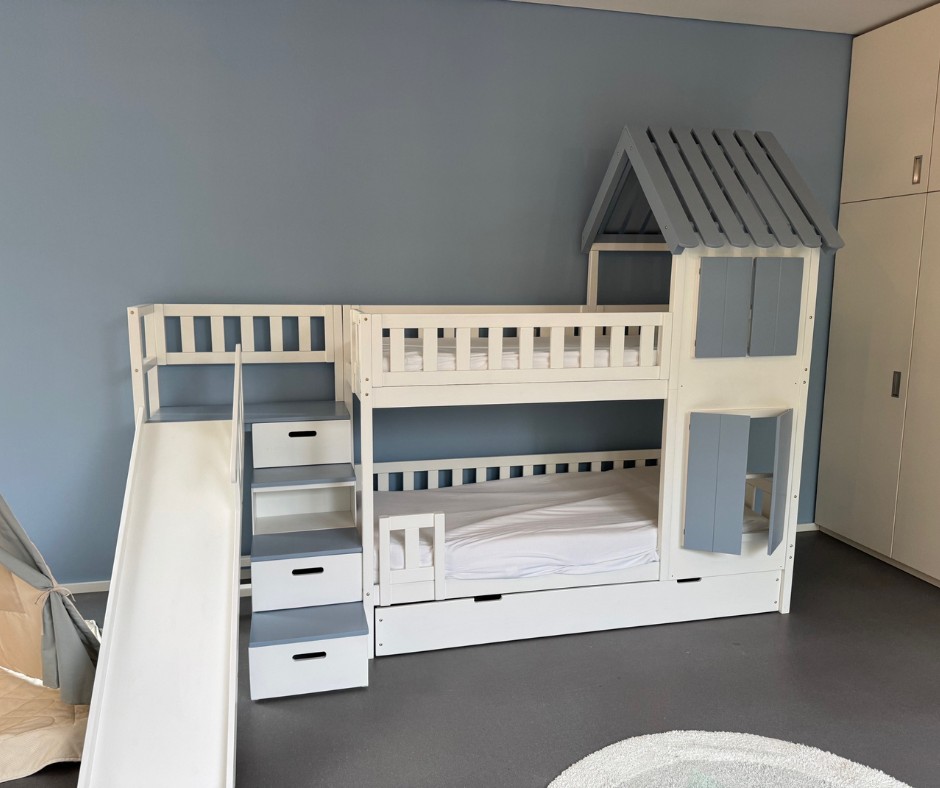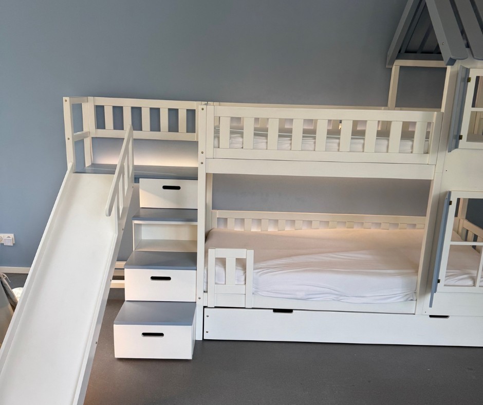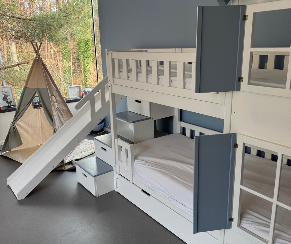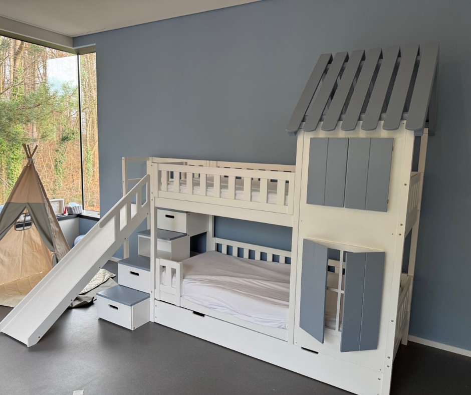Dit type design stapelbed met huisje en glijbaan wordt het hart van de kamer. Het is de plek waar kinderen wakker worden, spelen, lezen en hun eigen ritme ontwikkelen.