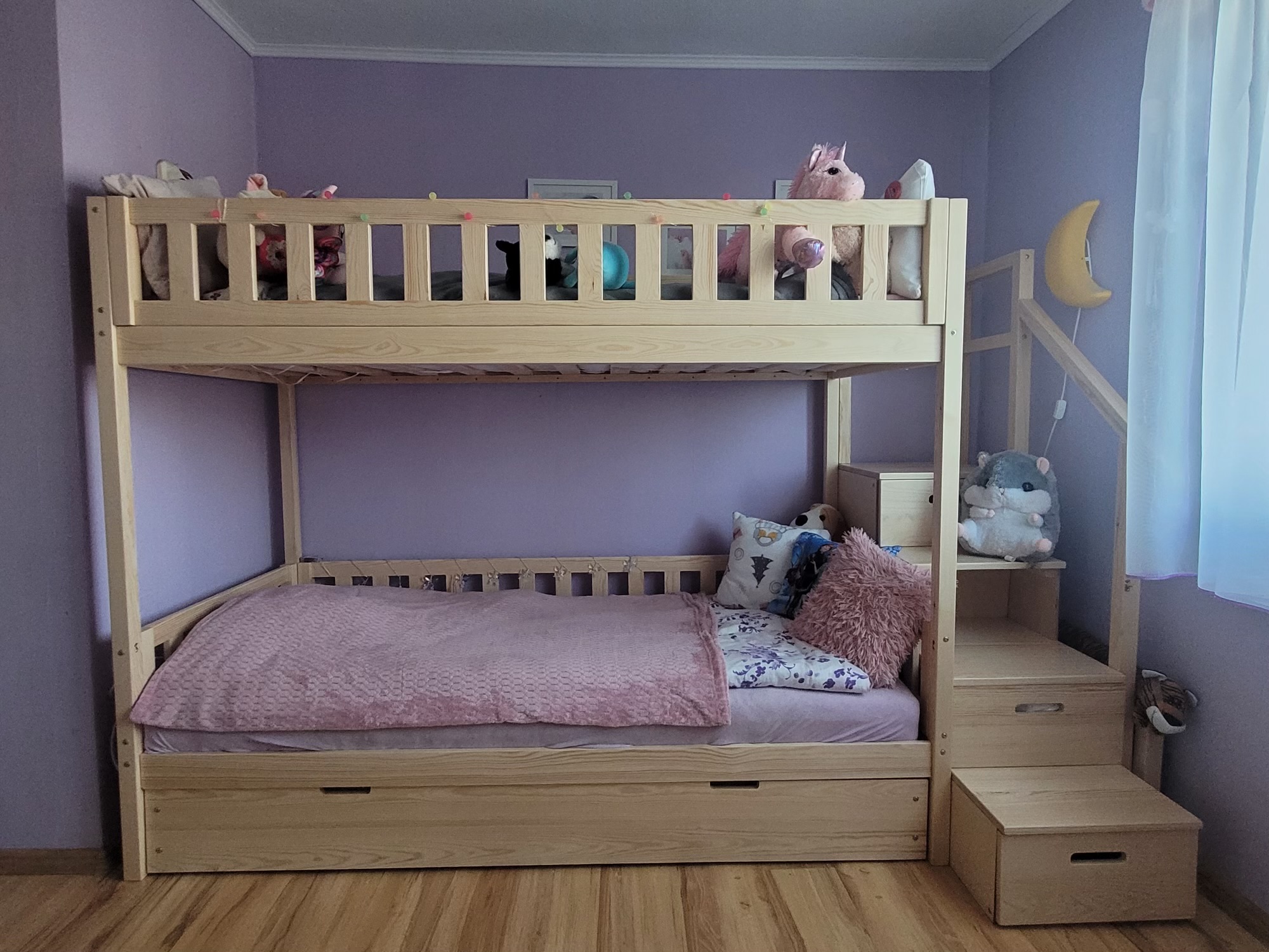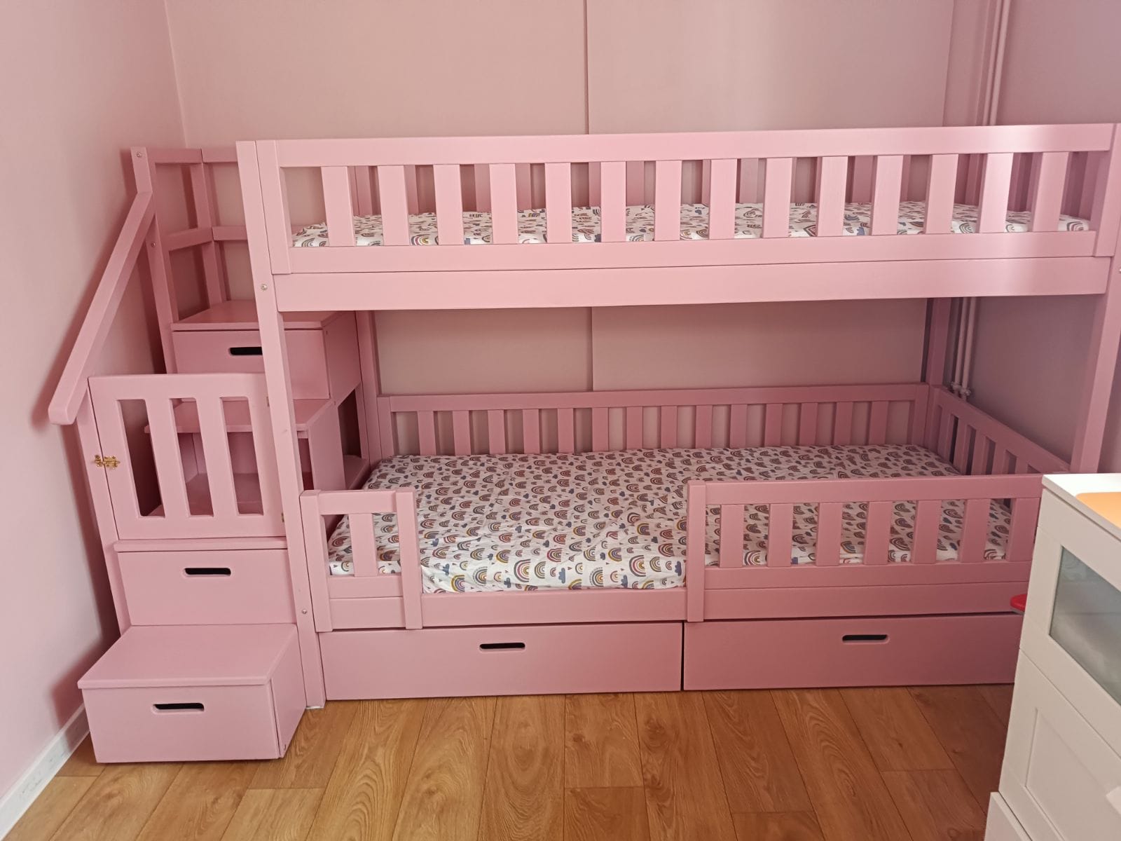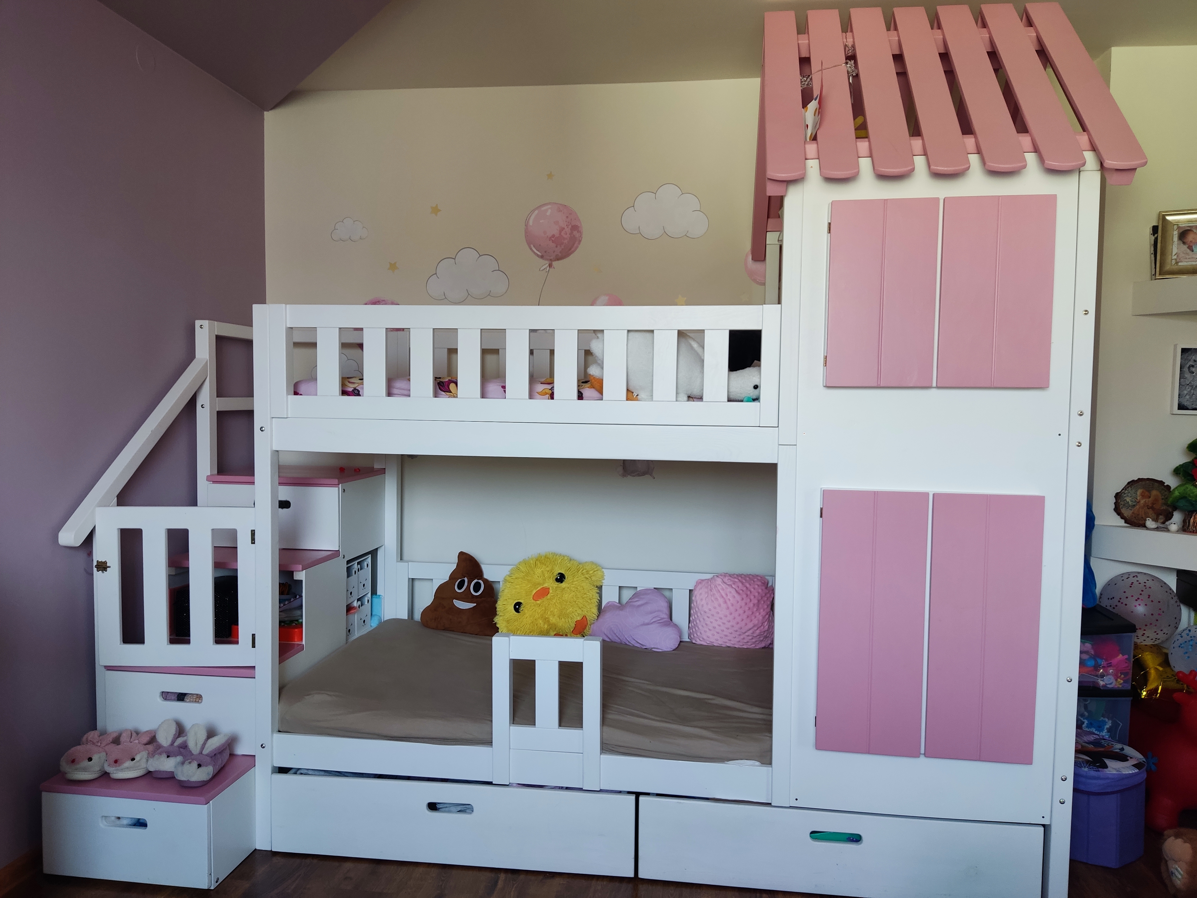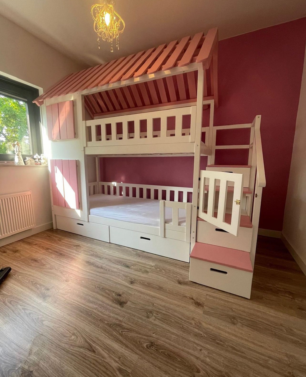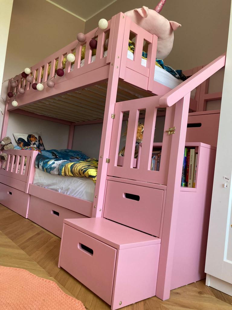 Stapelbed met trap en roze dak