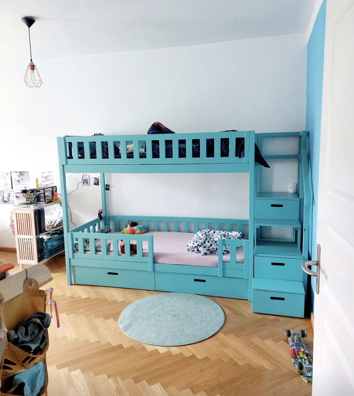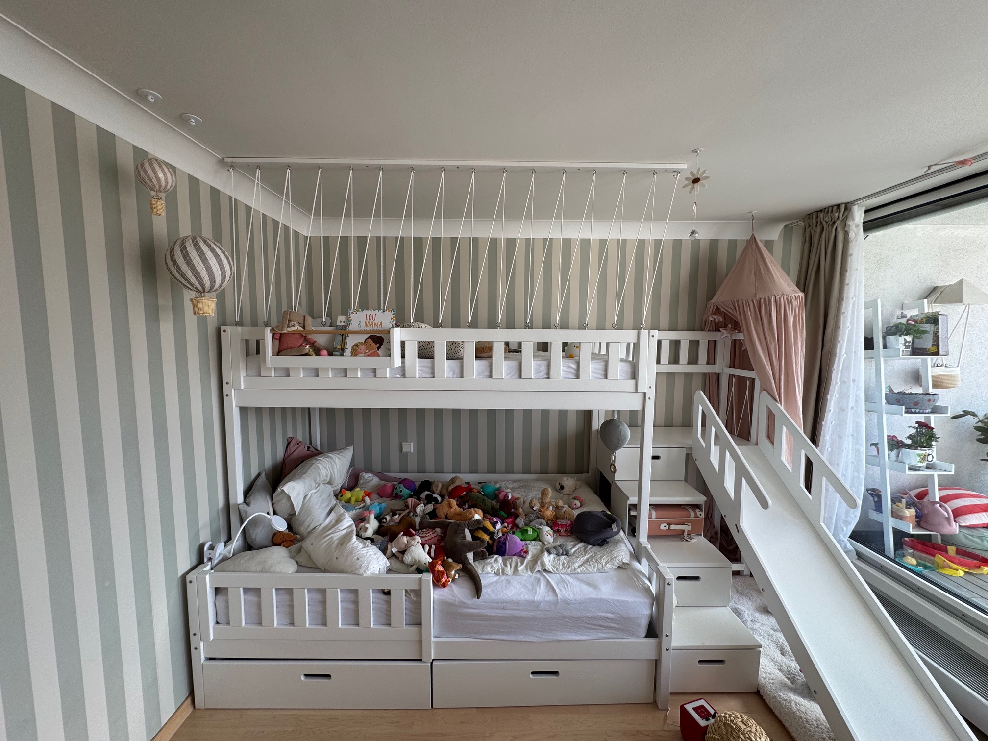 kinder stapelbed met trap en glijbaan in kinderkamer