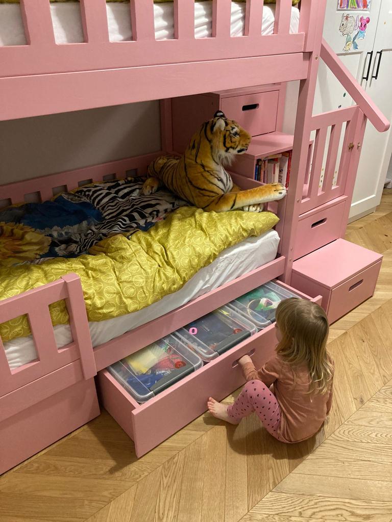 Het roze stapelbed is ontworpen met oog voor detail en dagelijks gebruik. De twee slaapplaatsen maken het ideaal voor broers en zussen of voor kinderen die graag een vriendje laten logeren. Tegelijkertijd zorgt het ontwerp ervoor dat de kamer open en overzichtelijk blijft.